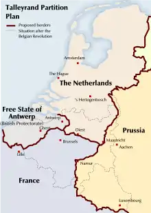 Em 20 de Dezembro de 1830 ocorre a Conferência de Londres de 1830, onde representantes diplomáticos de cinco países se reuniram: A Áustria, a França, o Reino Unido, a Prússia, e a Rússia. Inicialmente, houve discordâncias sobre uma Bélgica independente. A França, tomada por liberais em um período conhecido como a Monarquia de Julho, apoiava a independência da Bélgica, enquanto que as outras nações apoiavam o status quo na Europa — as Guerras Napoleônicas ainda estavam na memória dos europeus. Nesta conferência, uma das soluções propostas foi a do embaixador francês, Charles-Maurice de Talleyrand-Périgord, conhecida como o plano de partição de Talleyrand. O plano foi rejeitado pelos outros países.