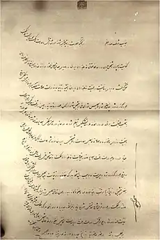 ![]() A proclamação real de Mozafaradim Xá Cajar, concordando com a monarquia constitucional em 05 de agosto de 1906. | |