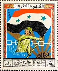 ![]() Selo iraquiano de 1969 celebrando os 10 anos da Revolução de 14 de Julho. | |||||||