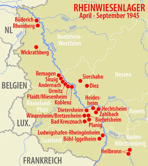 Em 12 de junho de 1945, as forças britânicas passaram a controlar dois campos Rheinwiesenlager que estavam em zonas britânicas. Em 10 de julho de 1945, todas as libertações foram interrompidas após o Supremo Comando dos Aliados passar o controle dos campos aos franceses. O acordo foi fechado porque o governo de Charles de Gaulle queria 1.75 milhões de prisioneiros de guerra para trabalhos forçados na França. No total, cerca de 182.400 prisioneiros de Sinzig, Andernach, Siershahn, Bretzenheim, Dietersheim, Koblenz, Hechtzheim e Dietz foram entregues à França.[6]