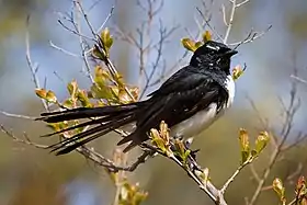 A cauda-de-leque-de-garganta-preta (Rhipidura leucophrys) é uma ave passeriforme nativa da Austrália, Nova Guiné, ilhas Salomão do arquipélago de Bismarck e da Indonésia oriental.[1] Trata-se de uma ave comum e familiar em grande parte do seu território, vivendo na maior parte dos habitats à exceção da floresta cerrada. Medindo 19-21,5 cm de comprimento, a cauda-de-leque apresenta contraste cromático acentuado, com a metade superior negra e a metade inferior branca, idêntica em ambos os sexos. Há três subespécies reconhecidas; Rhipidura leucophrys leucophrys, presente no sul e centro da Austrália, a pequena R. l. picata no norte da Austrália, e a maior R. l. melaleuca da Nova Guiné e ilhas vizinhas.
