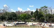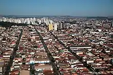 Na primeira metade do século XX, Ribeirão Preto continuou atraindo imigrantes nacionais e internacionais. Um novo grupo de destaque são os japoneses, sendo o município, considerado "berço da imigração japonesa" por receber uma parte dos primeiros imigrantes que chegaram ao Brasil em 1908.[51] Também é expressiva a chegada de árabes, especialmente sírio-libaneses. O município também atraiu durante esse século pessoas de todo o estado de São Paulo e de todo o Brasil, sendo os mais numerosos, de acordo com o censo 2000, os mineiros, paranaenses e baianos.[44] Esse aumento da população foi acompanhado da expansão do tecido urbano para além do núcleo original. Um dos bairros mais antigos da cidade surgiu em 1893, com o loteamento do Núcleo Colonial Antônio Prado. O bairro Barracão surgiu nas imediações da estação ferroviária de mesmo nome, a principal estação no qual chegavam os imigrantes que iriam trabalhar na lavoura cafeeira. Com o adensamento populacional o bairro se subdividiu, mantendo a linha férrea da Mogiana como marco fronteiriço no qual surgiram o Barracão de Baixo, atual Campos Elísios, e o Barracão de Cima, onde atualmente localiza-se o Aeroporto Estadual Dr. Lopes. Por ser um pouco afastado do centro, esse bairro carecia de infraestrutura urbana, chegando a níveis alarmantes nos primeiros anos do século XX. As transformações, embelezamentos e modernização urbana ficaram por muito tempo restritas ao centro da cidade. Recursos implantados no centro como rede de água (1898), esgoto (1900) e energia elétrica (1899) não chegaram com a mesma velocidade nas áreas mais afastadas, ocorrendo somente nas décadas de 1910 e 1920, após seguidas reivindicações da população.[48] Outro bairro surgido no fim do século XIX é a Vila Tibério, embora seu adensamento populacional tenha se dado nas primeiras décadas do século XX. Localizada no atual centro urbano de Ribeirão Preto, próximo da Catedral Metropolitana, o bairro teve seus primeiros arruamentos planejados a partir do fracionamento da Fazenda Monte Alegre em 1880. Por ser mais acessível à classe trabalhadora da época, sua população inicial se dividia entre os imigrantes italianos que trabalhavam nessa fazenda e funcionários das primeiras indústrias instaladas nas imediações do centro. Embora próximo, o bairro era inicialmente isolado da cidade pelo "muro de ferro" dos trilhos da Mogiana e tinha apenas um acesso pela rua Luiz da Cunha.[52]