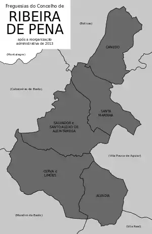 - Ribeira de Pena (Salvador) e Santo Aleixo de Além-Tâmega (sede do município)