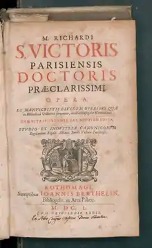 Ricardo de São Vitor, C.R.S.A. (m. 10 de março de 1173) é reconhecido atualmente como um dos mais influentes pensadores de sua época. Ele foi um importante teólogo místico e prior da famosa Abadia de São Vitor, agostiniana, em Paris entre 1162 até sua morte.