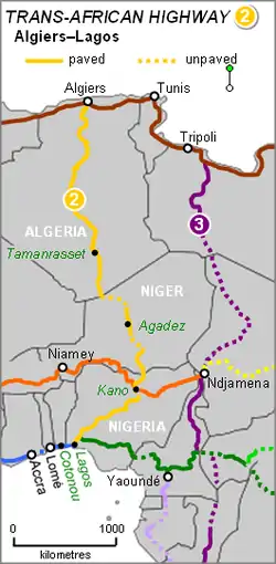 A Rodovia Argel – Lagos tem um longo aproximado de 4.500 km, dos quais uns 85% se encontra pavimentado. Atravessa três países: Argélia, Níger e Nigéria. No entanto, um enlace adicional de 3.600 km de rodovias para Tunísia, Mali e Chade são consideradas pelos planejadores como parte integral da Rodovia Transaariana.