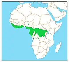Pode ser encontrada nos seguintes países: Angola, Benin, Camarões, República Centro-Africana, República do Congo, República Democrática do Congo, Costa do Marfim, Guiné Equatorial, Gabão, Gana, Guiné, Guiné-Bissau, Libéria, Mali, Nigéria, Serra Leoa, Togo e Uganda.[2]