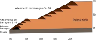 A barragem 1 do Córrego do Feijão foi construída em 1976 pela Ferteco Mineração, adquirida pela Vale em 2001. Foi ampliada em várias etapas e por diversos projetistas e empreiteiros. Houve, portanto, sucessivos alteamentos para montante, isto é, várias construções de degraus com os próprios rejeitos.[35] No cadastro nacional da Agência Nacional de Mineração (ANM) e de acordo com o Instituto Mineiro de Gestão das Águas (IGAM), a barragem era avaliada como uma estrutura de pequeno porte com baixo risco, e tinha a classificação de alto dano potencial, a maior classe da legislação, ou seja, de grande potencial poluidor, com dano potencial associado alto, que traz perdas de vidas humanas e impactos econômicos,[36] sociais e ambientais.[30] Como agravante, a barragem não possuía contrato de seguro, pois estava inativa.[37]