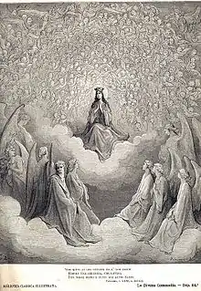 Finalmente, por intercessão de Maria, Dante, na companhia de Beatriz, pode contemplar diretamente Deus que se mostra a ele como a Rosa Celestial; no Empíreo, uma luz rodeada por círculos concêntricos de anjos.