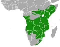 Pode ser encontrada nos seguintes países: Angola, Botswana, Burundi, República do Congo, República Democrática do Congo, Djibouti, Etiópia, Gabão, Quénia, Malawi, Moçambique, Namíbia, Ruanda, Somália, África do Sul, Sudão, Essuatíni, Tanzânia, Uganda, Zâmbia e Zimbabwe.[1]