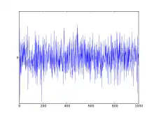 Estar não correlacionado no tempo não restringe os valores que um sinal pode ter. Qualquer distribuição de valores é possível (no entanto, deve haver polarização de corrente contínua zero). Mesmo um sinal binário que só pode assumir os valores 1 ou -1 será branco se a seqüência for estatisticamente não correlacionada. O ruído que tem uma distribuição contínua, tal como uma distribuição normal, pode naturalmente ser branco.