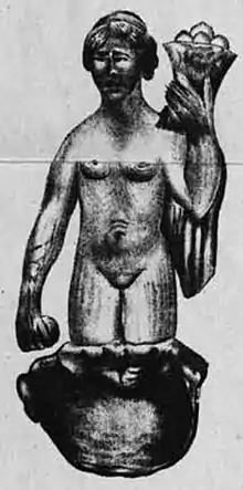 Uma das peças mais significativas encontradas no sítio arqueológico foi uma pequena estátua em bronze, representando uma figura de pé, que estava parcialmente no interior de um contentor de bordo decorado, possivelmente uma cesta.[6] A figura está nua, sendo de destacar a atenção dada ao pormenor dos cabelos, que estavam seguros por um diadema.[6] Em cima do ombro direito tem um vaso com maçãs, segurado com uma mão, enquanto que a outra, no final de um braço estendido junto ao corpo, segura um vaso de fundo estreito.[6] A figura tinha duas asas por debaixo dos ombros, já parcialmente partidas, e no fundo da cesta tinha um furo, talvez para colocar em cima de um pedestal.[6] Estácio da Veiga especulou que a estátua podia ser um signum, ou a representação da deusa abundância, que era a protectora da riqueza.[6] A estátua foi oferecida pelo redactor da Gazeta do Algarve, Augusto Feio Soares de Azevedo, a Estácio da Veiga.[6] Foi igualmente descoberta uma estatueta de um cupido alado.[5]