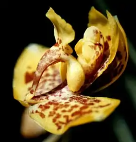 A inflorescência é racemosa, longa, pendente, e brota da base dos pseudobulbos. Pode ter de uma até muitas flores, de tamanho médio ou pequenas, mas vistosas, em regra com sépalas e pétalas pintalgadas, e que possuem labelo com longo unguículo, profundamente trilobado com um disco caloso ou verrucoso, mento regular, e lobos laterais eretos, coluna com pé proeminente, mas curta ou quase nula, e quatro polínias em dois pares.