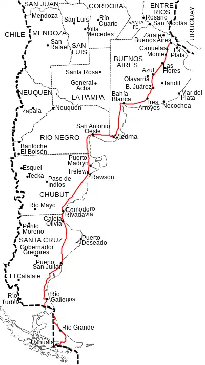 | Interseções | RN 205 em Cañuelas, RN 226 em Azul, RN 228 em Tres Arroyos, RN 249 na "paraje Bajo Hondo", RN 252 em Grünbein, RN 22 Próximo de Argerich, RN 250 na "paraje Zanjón de Oyuela", RN A025 a 24 km a leste de San Antonio Oeste, RN 251 e RN A026 em San Antonio Oeste, RN 23 a 36 km a oeste de San Antonio Oeste, RN A010 em Puerto Madryn, RN 25 em Trelew, RN 26 em Rada Tilly, RN 281 em Jaramillo, RN 288 em Comandante Luis Piedra Buena e RN 40 na "paraje Güer Aike" |