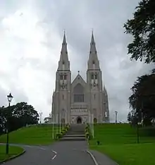 A catedral fica em uma colina, assim como sua contraparte anglicana, Catedral de São Patrício (Armagh).