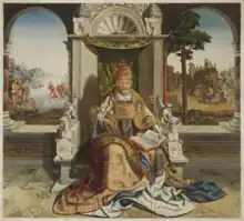 No primeiro plano, verifica-se um traço minucioso e preciso no delinear da figura e do trono de inspiração italiana. Os pormenores sensíveis bem definidos, uma constante em todo o percurso do pintor, evidencia-se na riqueza decorativa da capa em brocado, com inúmeras jóias incrustadas e anjos pintados que seguram os instrumentos da Paixão, no pluvial, nos anéis sobre as luvas, nos elementos decorativos do ladrilhado perspectivamente traçado ou nos putti que decoram os braços do trono.[1]