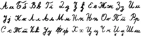 O alfabeto cirílico sérvio cursivo está ilustrado abaixo (a ordem das letras corresponde à utilizada na tabela anterior):