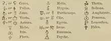 Conforme mais novos asteroides foram descobertos, os astrônomos continuaram a atribuir símbolos a eles. Assim, 7 Iris tinha como símbolo um arco-íris com uma estrela;[54] 8 Flora, uma flor;[54] 9 Metis, um olho com uma estrela;[55] 10 Hygiea, uma cobra ereta com uma estrela em sua cabeça;[56] 11 Partenope, um peixe em pé com uma estrela;[56] 12 Victoria, uma estrela encimada por um ramo de louro;[57] 13 Egeria, um broquel;[58] 14 Irene, uma pomba carregando um ramo de oliveira com uma estrela na cabeça;[59] 15 Eunomia, um coração coberto por uma estrela;[60] 16 Psyche, uma asa de borboleta com uma estrela;[61] 17 Thetis, um golfinho com uma estrela;[62] 18 Melpomene, uma adaga sobre uma estrela;[63] e 19 Fortuna, uma estrela sobre a Roda da Fortuna.[63]