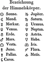 Os símbolos astronômicos são símbolos pictóricos abstratos usados para representar objetos astronômicos, construções teóricas e eventos observacionais na astronomia europeia. As formas mais antigas desses símbolos aparecem em textos de papiro grego do final da antiguidade. Os códices bizantinos nos quais muitos textos de papiro grego foram preservados continuaram e ampliaram o inventário de símbolos astronômicos.[2][3] Novos símbolos foram inventados para representar muitos planetas e planetas menores descobertos nos séculos XVIII a XXI.