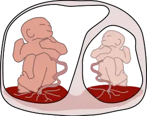 Como resultado do compartilhamento de uma única placenta, as circulações sanguíneas dos gêmeos monocoriônicos pode se conectar. embora cada feto use sua própria porção da placenta, os vasos sanguíneos conectados na placenta permitem que o sangue passe um gêmeo para o outro.