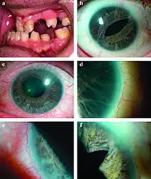 a) Microdontia e hipodontia. b) Pupila fendida e atrofia da íris no olho direito. c) Corectopia com atrofia da íris no olho esquerdo. d) Olho direito do embriotoxônio posterior. e) Embriotoxônio posterior do olho esquerdo. f) Ampla sinéquia anterior periférica do olho direito