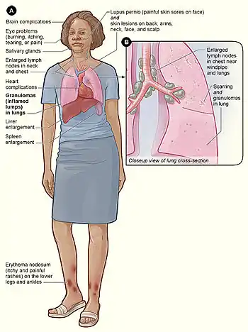 Clinicamente, esta síndrome é caracterizada pela instalação aguda do eritema nodoso, linfadenopatia hilar bilateral e/ou paratraqueal e artrite, comumente nas articulações inferiores, acompanhada de febre.