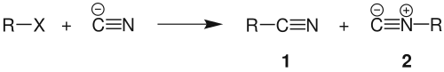 A proporção em que formam-se ambos os isômeros depende do solvente e do mecanismo de reação. Com a aplicação de cianetos alcalinos tais como cianeto de sódio e solventes polares o tipo de reação é uma reação SN2 pelo qual o haleto de alquilo é atacado pelo átomo de carbono mais nucleofílico do íon cianeto. Esse tipo de reação junto com dimetilsulfóxido como um solvente é um conveniente método para a síntese de nitrilas.[2] O uso de DMSO foi um grande avanço no desenvolvimento desta reação, como funciona impedindo estericamente mais para eletrófilos (haletos secundários e de neopentilo) sem reações laterais de rearranjo.