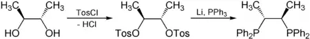 Síntese de pool quiral é usada para construir uma parte da molécula de Epothilone (uma alternativa ao Paclitaxel), da prontamente disponível (–)-pantolactona enantiopura.[1] 2,3-Butanodiol enantiopuro é usado para sintetizar chiraphos:[2]