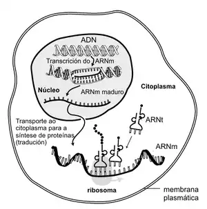 Ocorre no interior do núcleo das células e consiste na síntese de uma molécula de RNA m (RNA Mensageiro) a partir da leitura da informação contida no gene de uma molécula de DNA. Este processo inicia-se pela ligação de um complexo enzimático à molécula de DNA, o RNA-polimerase. A enzima helicase desfaz a dupla hélice, destruindo as ligações de hidrogênio que ligam as bases complementares das duas cadeias, afastando-as. O RNA-polimerase, inicia a síntese de uma molécula de RNA m de acordo com a complementaridade das bases nitrogenadas. Nesse processo, as bases pareiam-se: a adenina do DNA se liga à uracila do RNA m, a timina do DNA com a adenina do RNA m, a citosina do DNA com a guanina do RNA m, e assim sucessivamente, havendo a intervenção da enzima RNA-polimerase. Quando a leitura termina, a molécula RNA m separa-se da cadeia do DNA, esta restabelece as ligações de hidrogênio e a dupla hélice é reconstituída.