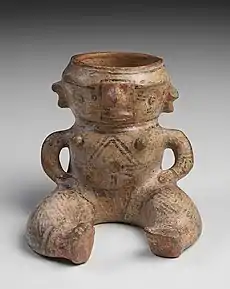 ![]() Vaso cerimonial de Santarém datado de cerca de 1.000 a 1.400 A.D. que representa uma figura feminina sentada, com pernas inflectidas, totalmente recoberta por pintura corporal com motivos geométricos em preto e vermelho sobre fundo branco. | |