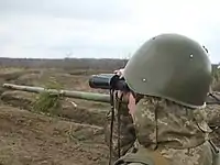 Soldado ucraniano usando um capacete SSh-60 durante um treinamento de artilharia, 24 de março de 2016.