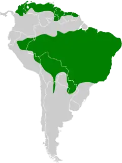 Pode ser encontrada nos seguintes países: Argentina, Bolívia, Brasil, Colômbia, Guiana Francesa, Guiana, Paraguai, Peru e Venezuela.[1]