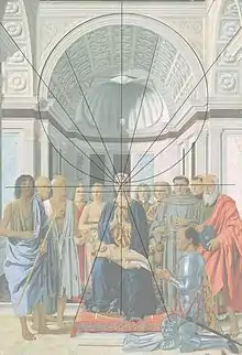 A elaboração perspética da pintura converge para um único ponto de fuga, colocado ao nível dos olhos da Virgem, cujo rosto oval está perfeitamente alinhado com o ovo de avestruz pendurado na bacia absidal e de que reproduz a forma perfeita. A harmonia da composição é obtida através da repetição de um módulo circular: o arco abobadado ao alto, o fundo marcado por painéis de mármore e os santos ao redor da Virgem sublinhando a estrutura semicircular da abside.