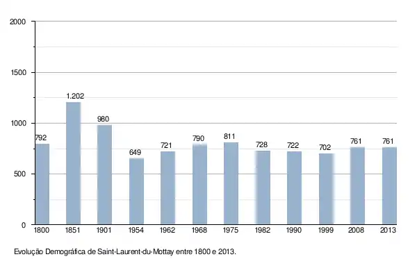 Os dados demográficos contemplados neste gráfico, referentes a ex-comuna de Saint-Laurent-du-Mottay[7] Foram colhidos, entre os anos 1800 e 1999, da página francesa EHESS/Cassini, e os demais dados da página INSEE.[8]