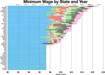 Os empregadores geralmente têm que pagar aos trabalhadores o salário mínimo mais alto daqueles prescritos pelas leis federais, estaduais e locais. Em janeiro de 2020, 29 estados e o Distrito de Columbia tinham salários mínimos superiores ao mínimo federal,[9] de modo que quase 90% dos americanos que ganhavam apenas o salário mínimo recebiam mais de 7,25 dólares por hora.[10] O salário mínimo nacional efetivo (o salário que o trabalhador com salário mínimo médio ganha) era de 11,80 dólares em maio de 2019; este foi o mais alto desde pelo menos 1994, o primeiro ano para o qual estão disponíveis dados sobre o salário mínimo efetivo.[10]