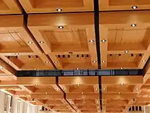 Ao longo do teto, há uma cobertura de policarbonato com extremidades arredondadas, que respeita o conceito do projeto original do edifício, mas usa materiais mais modernos. Telhas termo-acústicas foram usadas, ao invés de cobre, e de policarbonato ao invés de vidro.[14] O teto é vazado e está ligado com lustres napoleônicos – o projeto, inclusive, foi rejeitado na época da construção, pois o som iria entrar ou escapar. Esse projeto possibilita a apresentação de qualquer tipo de concerto, pautada pela alteração da sala de concertos e gerada pela flexibilidade do forro com painéis moveis; além disso, os elementos de composição foram concebidos para reflexão sonora multidirecional, atendendo a recomendações acústicas.[15][14]