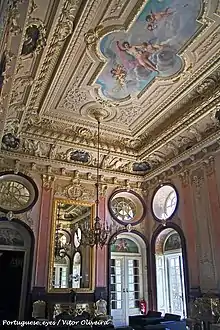 Nos finais do século XVIII, o arquitecto português José Manuel de Carvalho e Negreiros enumerou quais seriam as divisões de uma casa destinada a um membro da nobreza: «Plano Nobre: Sala de espera, antecâmara, sala de visitas, gabinete, toucador, oratório ou tribuna para a ermida, caza de jantar, câmara, guarda roupa com chaminé, caza de lavor, despejos».[25] Assim, o piso nobre deveria conter as divisões pessoais da família proprietária e os espaços destinados a receber os visitantes.[25] O principal compartimento deste piso era a sala, que em muitos casos era uma combinação de sala de jantar, de estar e de visitas.[25] Dois exemplos de salas de estar de aparência setecentista podem ser encontradas no Palácio de Estoi, no Sul de Portugal, que apesar de ter sido construído nos princípios do século XX, foi mobilado e decorado segundo estilos mais antigos, destacando-se o Salão Nobre e a Sala de Visitas, ambos inspiradas no Estilo Luís XV.[26]
