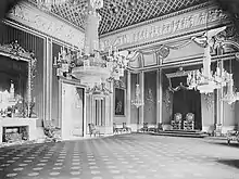 A sala do trono do Palácio de Buckingham, residência do Monarca Britânico na capital de Londres, é usada para reuniões judiciais e como uma segunda sala de dança. Ele é dominado por um arco de proscênio apoiado por um par de figuras aladas de 'vitória' segurando guirlandas sobre os dois tronos, que são originais da coroação da rainha em 1953.[1]