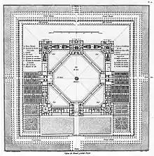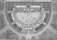 Ledoux voa grande neste primeiro projeto: é um projeto ambicioso, inovador e rompia com as construções tradicionais. Ledoux cria um projeto com uma geometria implacável: o recinto é organizado ao redor de uma imensa região quadrada. As diferentes construções são colocadas todas ao redor desta região central, ligadas por pórticos. Assim, temos algo como se fosse uma única construção. A fim de acelerar os serviços, o centro é dividido em diagonal como se fosse uma única construção, formando um octógono. As construções possuem várias colunas, fazendo com que as galerias cobertas fiquem apoiadas por 144 colunas dóricas.