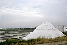 - Flor de sal - Trata-se da fina camada que flutua à superfície das salinas. Os primeiros e frágeis cristais são extraídos, diariamente, de forma cuidadosa. Antes de serem embalados são secos ao sol. A flor de sal é, por norma, usada em saladas, sopas, legumes cozidos e pratos de peixe ou carne grelhados, por forma a acentuar o sabor dos alimentos.[4]