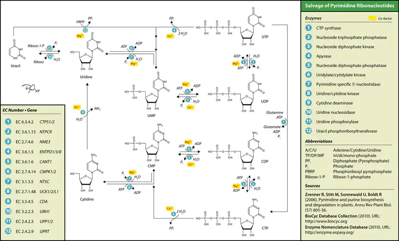 Os nucleosídeos citidina e desoxicitidina podem ser recuperados ao longo da via do uracil pela citidina desaminase, que os converte em uridina e desoxiuridina, respectivamente. Alternativamente, a uridina-citidina quinase pode fosforilá-los em monofosfato de citidina (CMP) ou monofosfato de deoxicitidina (dCMP). UMP/CMP quinase pode fosforilar (d)CMP em difosfato de citidina ou difosfato de deoxicitidina, o qual a nucleosídeo difosfato quinase pode se fosforilar em trifosfato de citidina ou trifosfato de deoxicitidina.