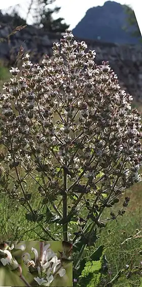Quanto à inflorescência, esta destaca-se por ser particularmente ramificada e por se formar a partir de verticilastros, onde despontam flores alvacentas, amiúde pontilhadas com manchas arroxeadas, entre Maio e Agosto.[2]