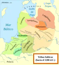 Os samogitianos no contexto das tribos bálticas, pelo ano 1200. Os bálticos orientais estão na tonalidade marrom enquanto ocidentais em tonalidade verde.