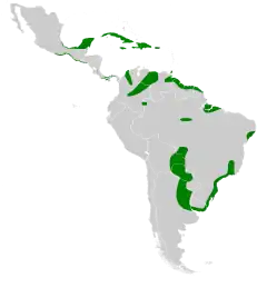 Pode ser encontrada nos seguintes países: Argentina, Belize, Bolívia, Brasil, Ilhas Caymans, Colômbia, Costa Rica, Cuba, República Dominicana, El Salvador, Guiana Francesa, Guatemala, Guiana, Haiti, Jamaica, México, Nicarágua, Panamá, Paraguai, Porto Rico, Suriname, Trinidad e Tobago, Uruguai, Venezuela, as Ilhas Virgens Americanas e possivelmente em Equador.[1]