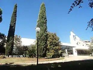 Os cômodos da paróquia ficam em dois blocos de teto plano separados. Um deles se liga ao canto direito da igreja e o outro quase toca o esquerdo formando um grande jardim triangular.
