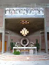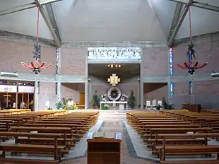O interior também tem uma planta circular. Sobre o altar, numa reentrância em oposição às portas de entrada, está um desenho da "Última Ceia" de Jesus com os Apóstolos. Importante é a capela do batistério, onde está uma pia batismal no formato de um odre. Ao lado dela está uma cruz em bronze em torno da qual estão representadas três pombas, também em bronze. Três grandes painéis em terracota representam mulheres indo buscar água a partir do ponto de vista da fonte. À direita está a caixa do órgão de tubos ao passo que a console está posicionada ao lado do presbitério. À esquerda está uma estátua da Madonna della Fiducia.
