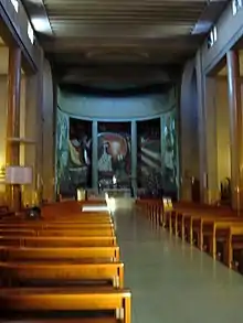 De particular relevância artística é a série de afrescos que decoram a abside, obra do sacerdote franciscano Ugolino da Belluno (1968-1969) e abençoados pelo papa Paulo VI em 1 de janeiro de 1970. Na época, a obra foi duramente criticada por seu visual moderno, suas cores, pela iluminação deficiente (através de uma claraboia, e pela maneira na qual eles foram pintados na parede de 480 m2. Entre duas altas colunas está uma imagem da "Virgem com o Menino e São Félix". Além dela, destaca-se também uma "Virgem das Flores", na qual Nossa Senhora veste um robe de flores enquanto entrega o Menino Jesus a São Félix, com capuz e prostrado. Abaixo estão imagens das crianças judias de Terezin, exterminadas pelos nazistas durante o Holocausto, e uma imagem de jornal de Mario Dominici, o garoto encontrado morto em Centocelle durante a Segunda Guerra Mundial como resultado das políticas antissemitas nazistas. Estão presentes também querubins e constelações do zodíaco contando a história da criação. Outras cenas tratam de contos moralizantes sobre ganância e contra a pornografia e cenas da vida de São Félix de Cantalice. No transepto estão outras obras do mesmo artista, "Aparição de Jesus entre Anjos" e "Visão de São Francisco", ambas de 1975.