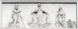 Escultura da fachada, localizada acima do portal: "Virgem Maria com os Santos João Evangelista e João Batista".