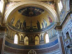Uma abside decorada com Mosaicos ainda preserva a memória de um dos mais famosos salões do antigo palácio, o "triclínio" do papa Leão III (r. 795–816), onde se realizavam os banquetes de estado. A estrutura existente não é antiga, mas partes dos mosaicos originais podem ter sobrevivido no mosaico triplo no nicho. No centro, Cristo dá aos apóstolos sua missão; à esquerda, Ele entrega as chaves do Reino de Deus ao papa São Silvestre I e o lábaro a Constantino I; à direita, São Pedro entrega a estola papal ao papa Leão III e o cetro a Carlos Magno.