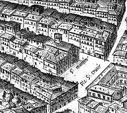 A igreja ficava na esquina da Piazza del Monte di Pietà com a Via dei Pompieri. Porém, a linha das fachadas deste quarteirão de frente para a praça costumava ficar num ângulo diferente da atual. Por isso, a fachada da igreja ficava no interior de um edifício moderno atualmente no local, inclinada para trás da esquerda para a direita[6].
