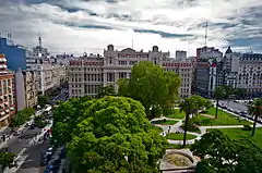 No entorno do Teatro Colón, estão localizadas duas praças: a Praça Lavalle, uma área verde urbana composta por três quarteirões; e a Praça do Vaticano. Entre as avenidas Leandro N. Alem e a Eduardo Madero, ficam outras quatro praças: a Praça Roma; a Praça Dr. Carlos Alberto Erro; a Praça Hipólito Bouchard; e a Praça José Razzano. Já a Praça Roberto Arlt, situada no cruzamento da Avenida Rivadavia com a Rua Esmeralda, e a Praça San Nicolás, situada no cruzamento da Avenida Corrientes com a Rua Reconquista, dividem os respectivos quarteirões com alguns edifícios.